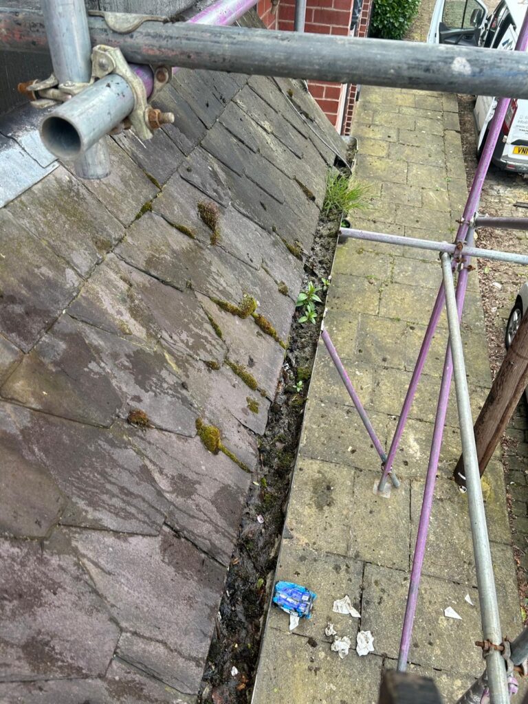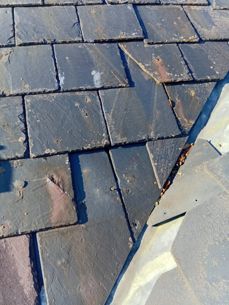 Scan for tiles that are obviously cracked, slipped out of position, or missing entirely. Don’t forget the roof edges (verges) where tiles often lift first in strong winds. On slate roofs, look for any that appear to be hanging at odd angles or have slipped down from their original position.